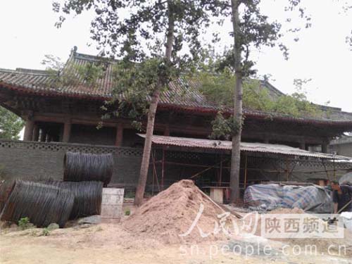 走近东岳庙,灰色的围墙将这座寺庙完全包围,若不是从围墙外看到了大殿顶部露出的古建筑特有的琉璃瓦,记者真的很难找到这座昔日的道教场所。推 开一扇红色大门,刻着醒目的“西安东岳庙文物保护管理所”的白色牌子挂在灰色古建筑之上,与到处堆放的钢筋、沙子、水泥、废弃的砖头、木条等杂乱的建筑垃 圾形成了鲜明对比。