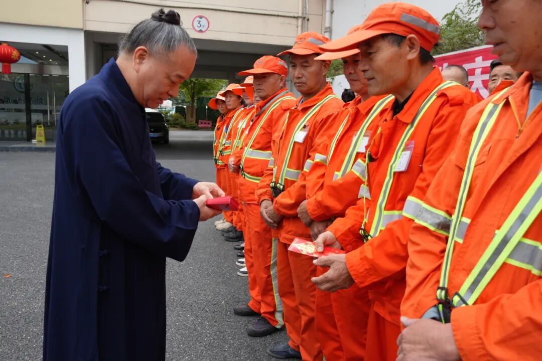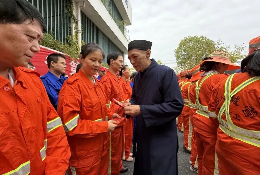 2025年10月26日,时值浙江省第29个环卫工人日与重阳节来临之际,杭州市道教协会会长董中基、副会长汪显庆、秘书长李翔一行先后赴杭州路通环境科技有限公司、拱墅区和睦街道幸之护理院、和睦社区老年乐养中心、华丰社区、李家桥社区、化纤社区开展走访慰问,向日夜奋战在环卫一线的“城市美容师”们、老人们分别送上节日祝福与关怀,践行道教“齐同慈爱、异骨成亲”的理念,弘扬道教的传统美德。在城市尚未苏醒之时,环卫工人已辛勤劳作于街头巷尾。董中基道长向环卫工人们致以节日的祝贺和亲切的问候,并表示希望通过实际行动,传递社会温暖,致敬平凡岗位上的奉献者,共筑和谐美好家园。