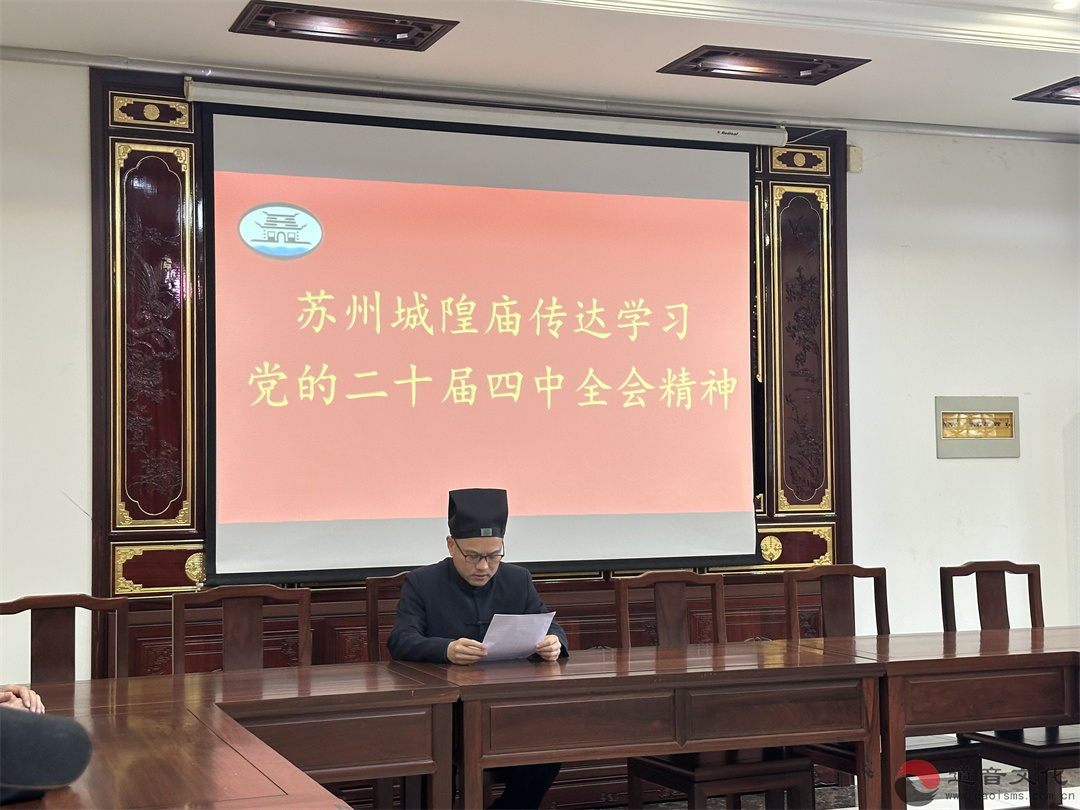 苏州城隍庙管委会副主任葛永宗道长向道职员工传达了党的二十届四中全会精神,要求城隍庙道职员工认真学习习近平总书记在全会上的重要讲话和全会通过的《中共中央关于制定国民经济和社会发展第十五个五年规划的建议》,坚持用党的二十届四中全会提出的新概念、新观点、新论断统一思想,将全会精神作为指导道教健康传承的重要遵循,以强烈的改革自觉主动适应新时代新要求,为中国式现代化全面推进强国建设、民族复兴伟业贡献力量。