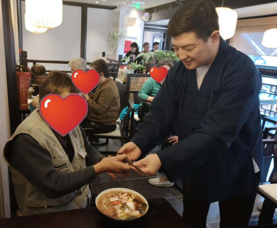 重阳糕甜美,长寿面也同样绵长。重阳节当日,邑庙慈爱为老社邀请了豫园街道部分老人来城隍庙免费品尝长寿面。新装修的五厨斋堂窗明几净,高雅整洁。老人们纷纷围坐一起品尝精心制作的长寿面,一片精神矍铄,喜气洋洋。